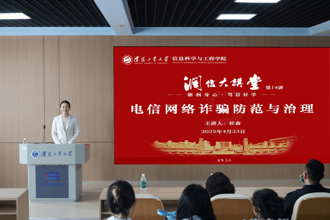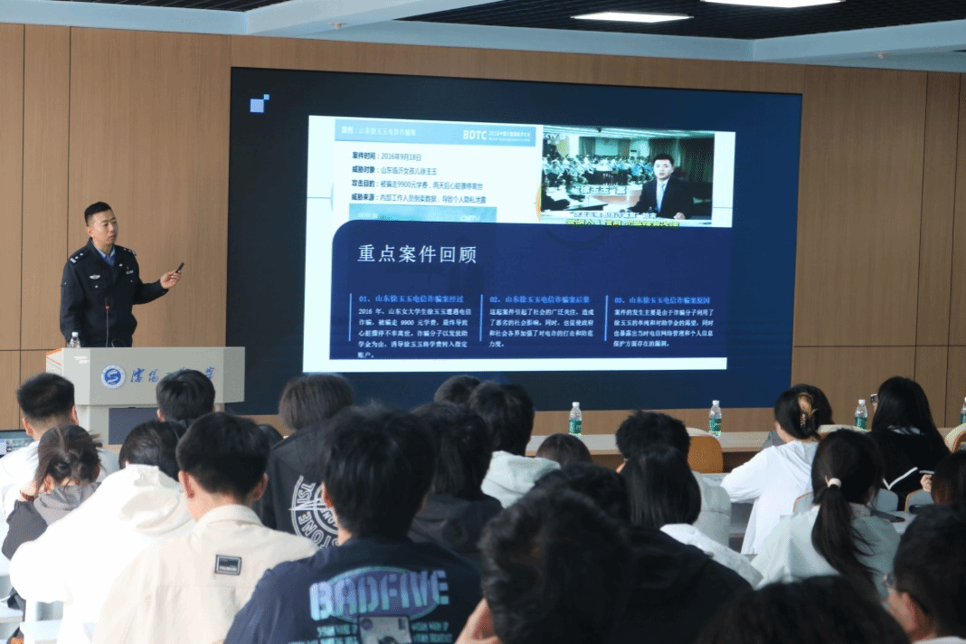 讲座中,杜森以“电信网络诈骗防范与治理:守护财产安全,共筑反诈防线”为题,从电信网络诈骗的认知与现状剖析、常见的电信网络诈骗犯罪的手段、防范策略与法律保障、避免参诈涉诈指南、公安机关反诈举措与成果等五个方面,通过一个个真实的案例,生动地呈现了电信诈骗的猖獗态势与严重危害,剖析了电信诈骗的常见手段,让同学们对诈骗的套路有了清晰的认识,提高了师生的防范意识及共同打击电信诈骗的决心与意志。杜森指出,电信网络诈骗是可以防范的,每一个人都是网络安全的一部分,希望同学们共同努力,共护网络安全净土,共筑网络安全防线。