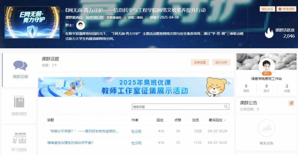4月14日至20日,学院通过易班优课开展网络文明素养提升行动,课程内容丰富,涵盖了话题讨论、网课学习、法律法规、线上考核等四个部分。同学们主动探索网络文明的丰富内涵,自主检验网络安全学习成果,有414人参与话题讨论,378人参与网课学习,334人自主学习法律法规,310人参与线上考核,活动达到了预期目标和效果。