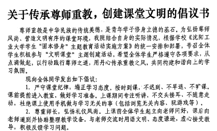 “传承尊师重教,创建文明课堂”系列活动自启动以来,强化系统化顶层设计、强调精细化组织实施,将尊师重教的传统美德融入课堂文明建设,得到了全院师生积极响应和热情参与,在思想铸魂与实践笃行中实现双维提升,夯实了学生成长成才的思想根基,为校园文化建设注入了新活力。