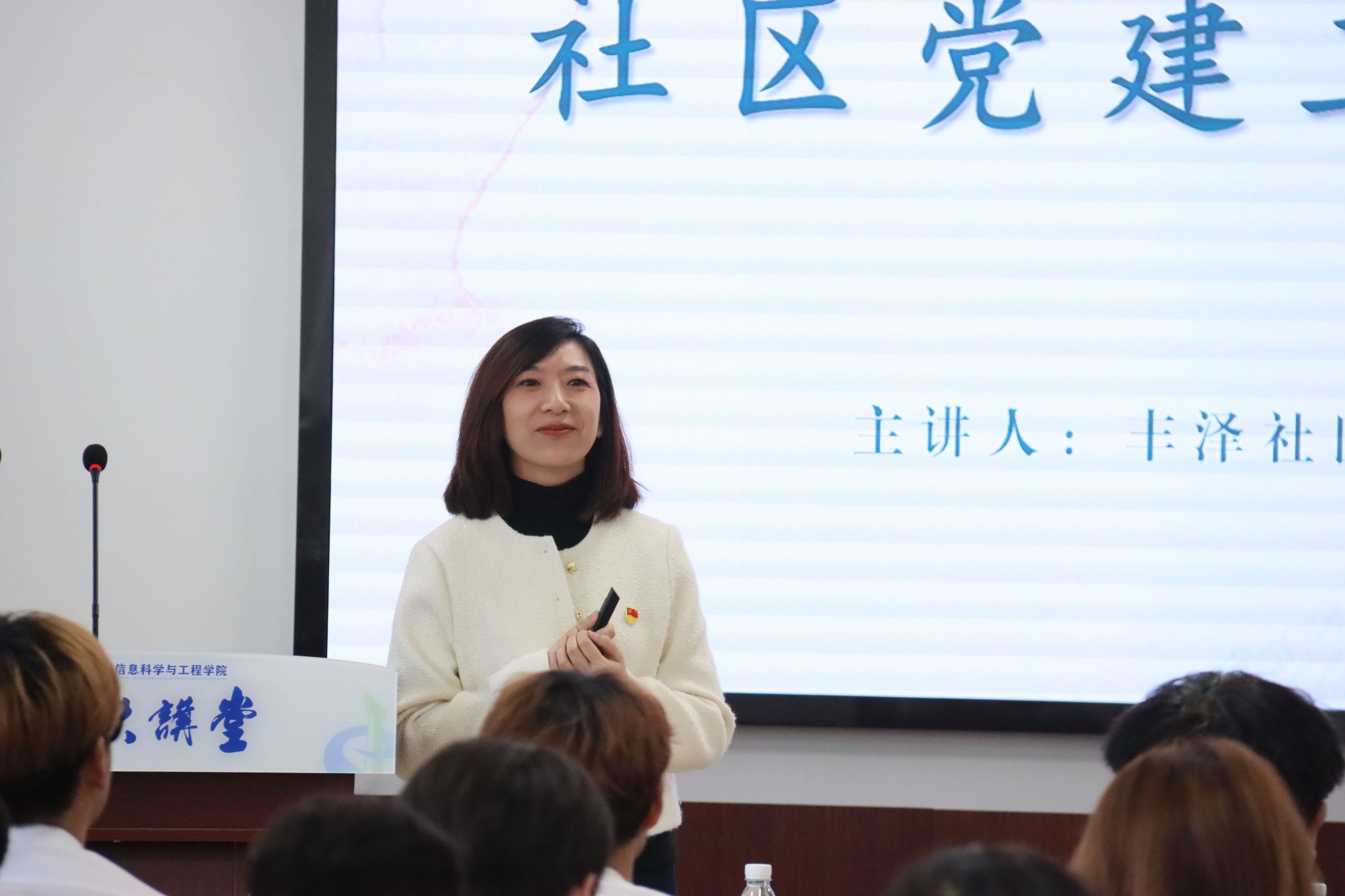 报告会上,王孝军从丰泽社区的党建引领、文化建设、志愿服务、多元保障等方面切入,重点介绍了“泽润365”党建品牌的创立和建设情况,详细解读了“泽润续航”职业技能培训、“润泽五色花”青少年幸福教育课堂、“润泽相伴”老年课堂、“馒时光”幸福长者食堂、“泽润医+N”医养服务、行善立德志愿者雷锋团等品牌建设情况。她还回顾了过去一年里,学院学生第五党支部、青年志愿者协会和大学生艺术团与丰泽社区联合开展活动的情况。在谈到学院与丰泽社区在“一站式”学生社区建设和党建共建时,她表示,双方合作的基础好、范围广,前景广阔、资源互补,希望经过双方的共同努力能够为青年大学生成长和社区居民安居乐业作出更大的贡献。她还热情邀请学院师生到丰泽社区参观实践。