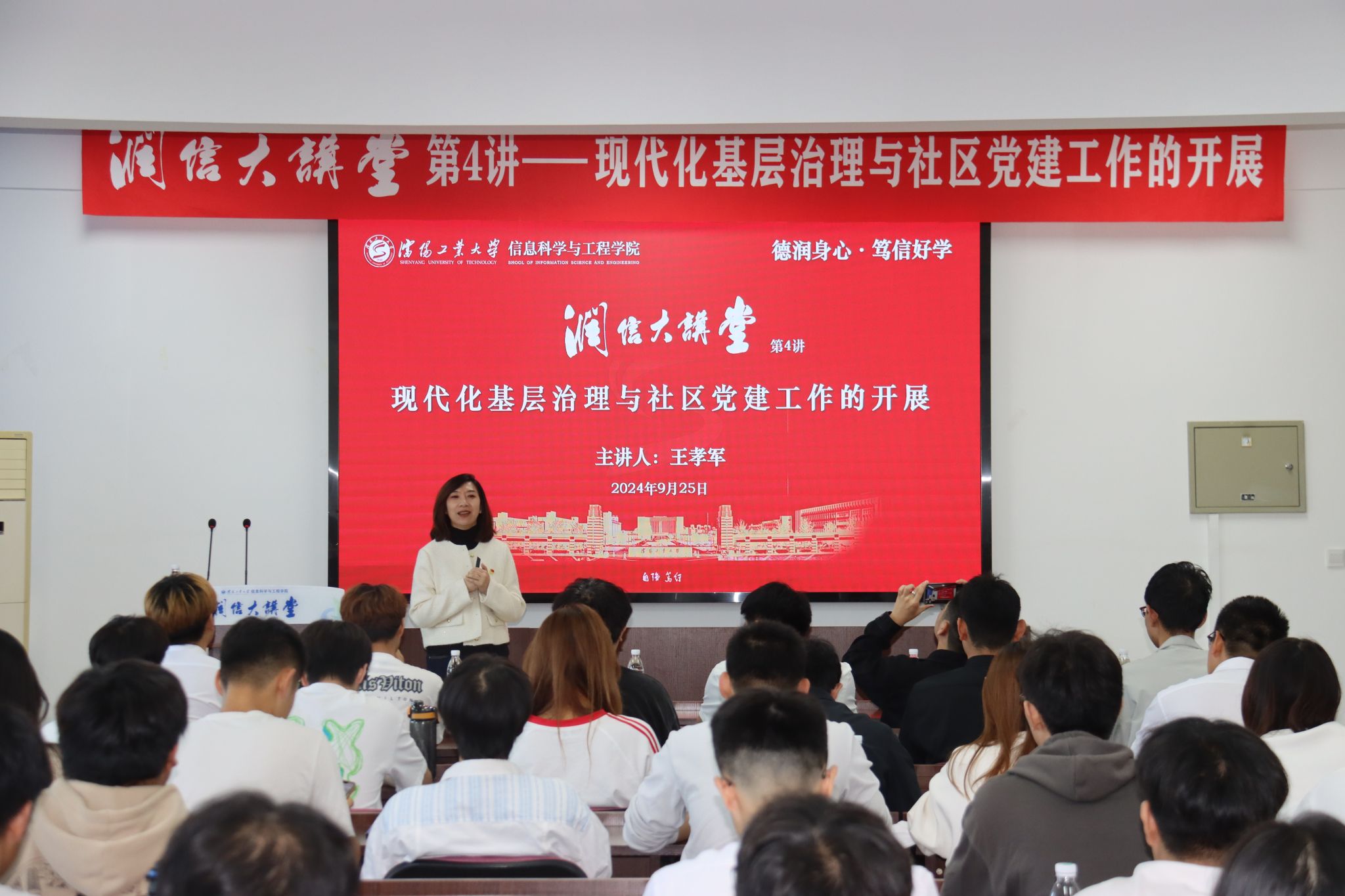 9月25日下午,润信大讲堂第四讲在学院楼529报告厅如期举行。本期润信大讲堂特邀沈阳市“五一劳动奖章”获得者,沈阳市和平区新华街道丰泽社区党委书记、居委会主任王孝军担任主讲嘉宾。王孝军以《现代化基层治理与社区党建工作的展开》为题做了一场专题报告。学院学生党支部书记、各班班长和团支部书记,以及学生代表等100余人参加了报告会。