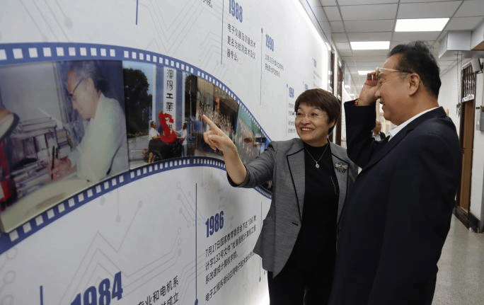 座谈会结束后,李春华和校友们一起来到学院历史沿革介绍长廊,为校友们介绍学院发展。