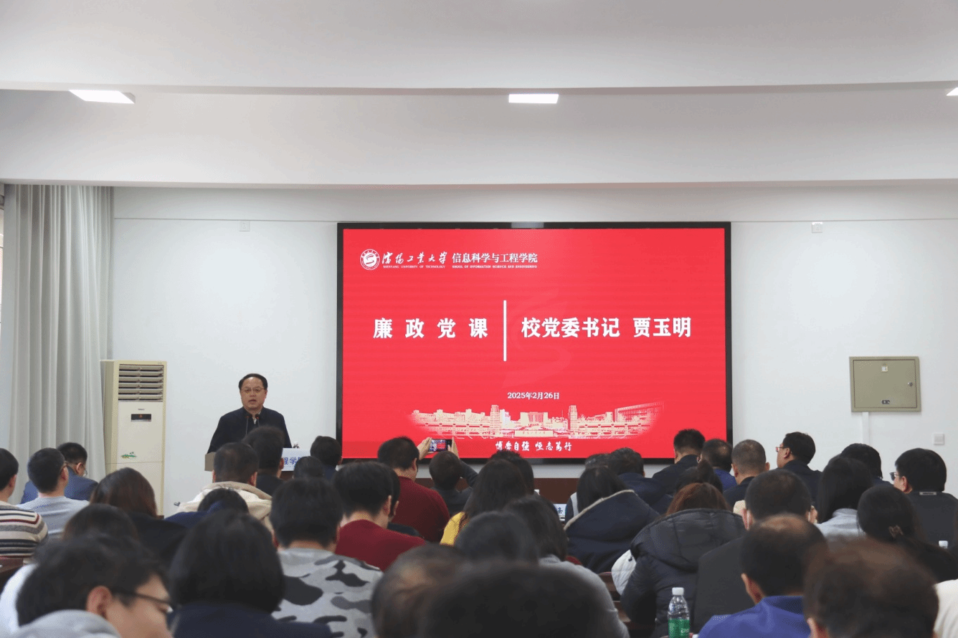 2 月 26 日下午,校党委书记贾玉明在学院 529 会议室为全院教师上了一堂生动的廉政党课。学院党委领导班子成员、党支部书记、各部门负责同志,以及百余名教师现场聆听了廉政党课。