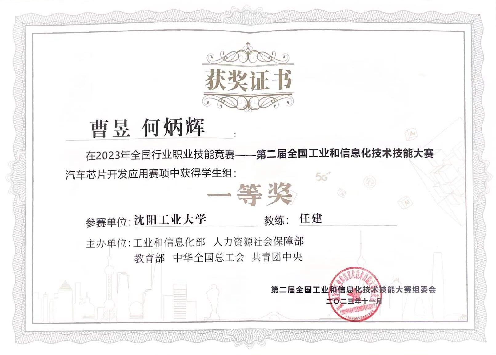 11月16至18日,由工业和信息化部、人力资源社会保障部、教育部、中华全国总工会、共青团中央共同主办的2023年全国行业职业技能竞赛——第二届全国工业和信息化技术技能大赛决赛在浙江省绍兴市举办。我院电子科学与技术专业2022级硕士研究生曹昱和何炳辉荣获“汽车芯片开发应用赛项”学生组全国一等奖,实现了我校及辽宁省在该项赛事中的突破。我院电子科学与技术系教师任建获得优秀教练奖。